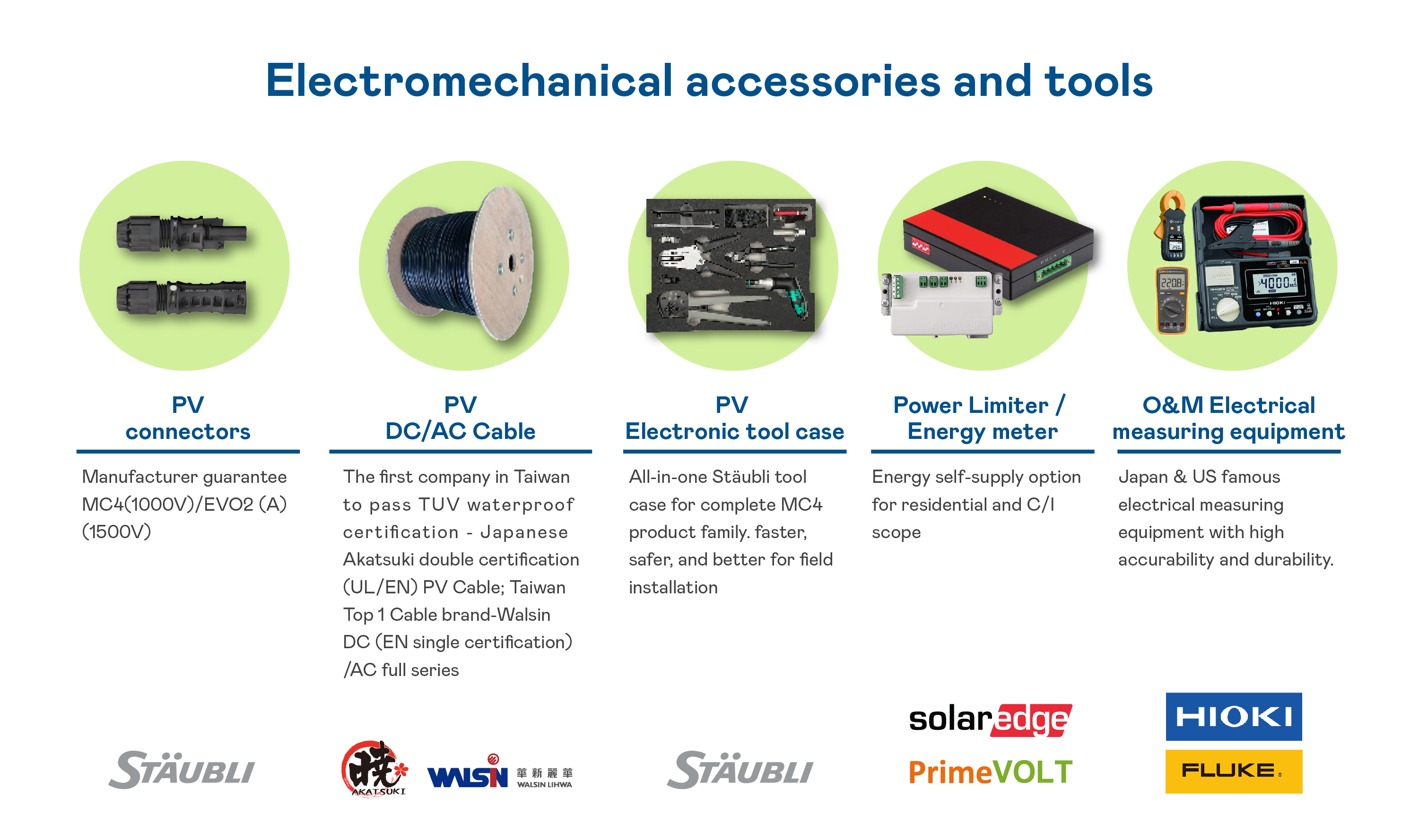 With its "one-stop shopping" service, AUO not only possesses its own solar modules, monitoring, software and hardware integration solutions, it also provides other reliable, high-quality components and products for the solar power plants of customers, including important components, such as converters, connectors, wires and cables, and component products, such as environmental monitoring devices, related auxiliary materials and tools.